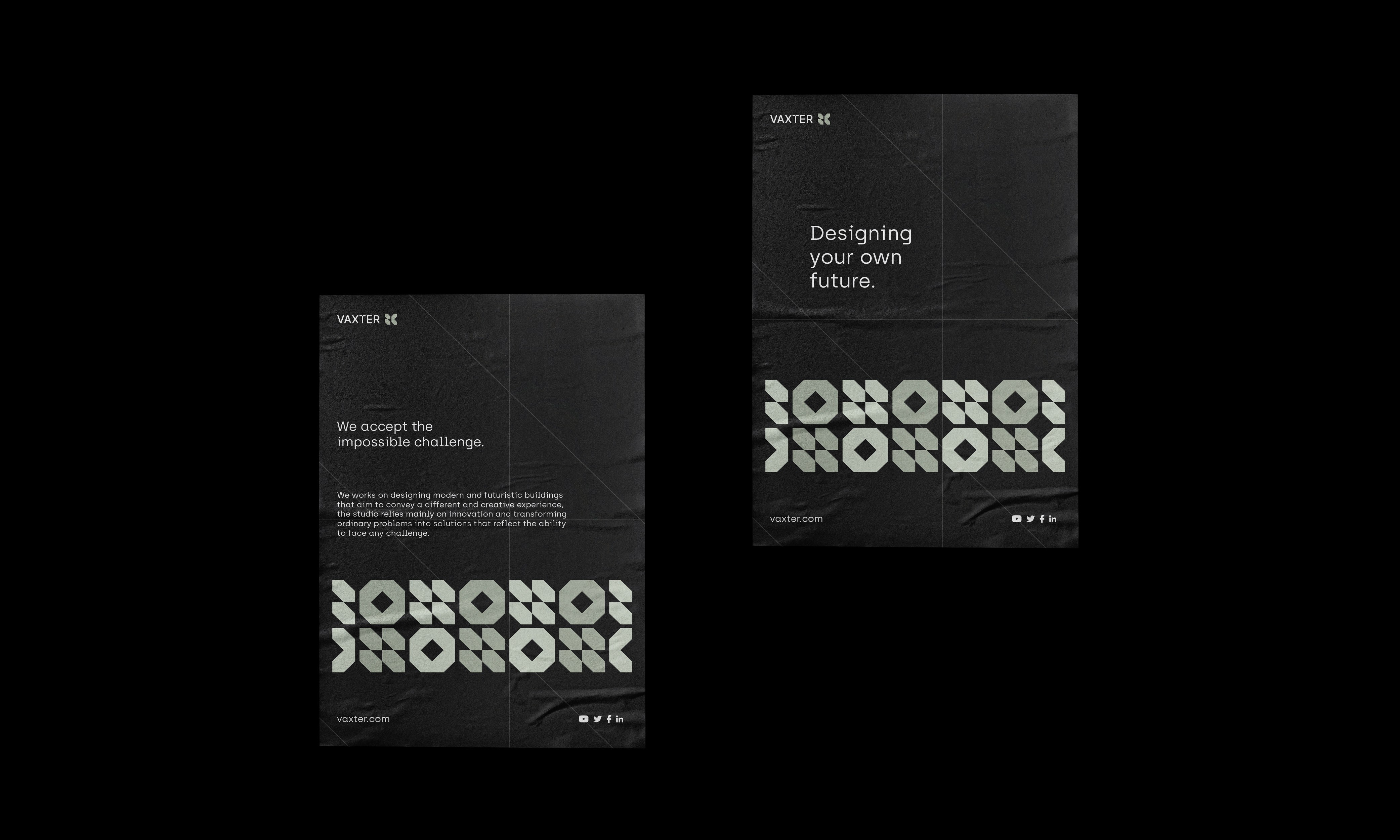 The brand identity was developed to mirror this philosophy. Built around harmony, geometry, and modern minimalism, the logo captures the balance between creativity and precision that defines Vaxter’s work. The visual system conveys professionalism, trust, and sophistication, embodying the studio’s dedication to shaping the future through bold, intelligent, and meaningful design.