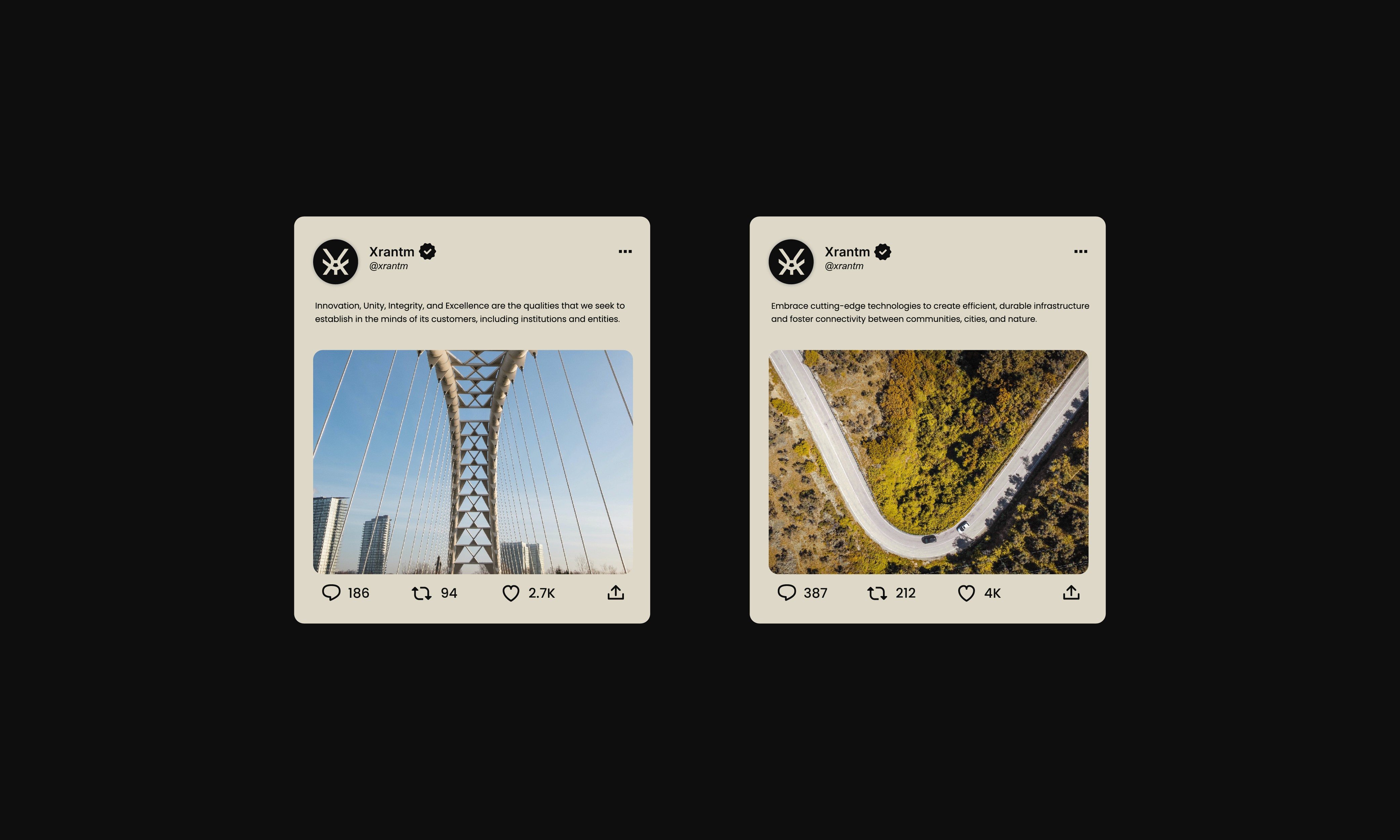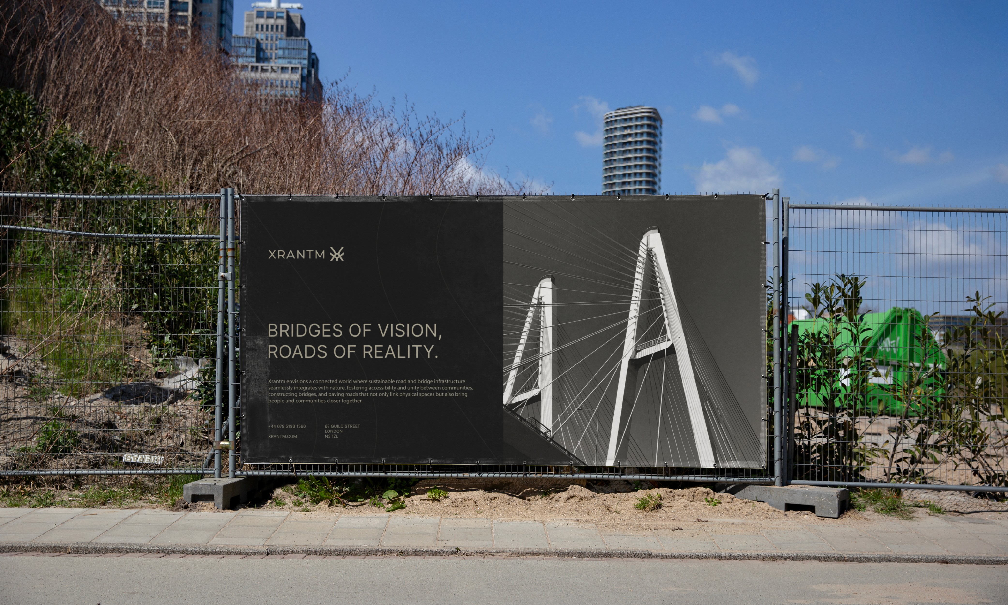 The creative challenge behind Xrantm’s brand identity was to translate this vision into a design language that reflects both professionalism and ambition. The logo’s flowing lines and dynamic curves were inspired by the forms of roads and bridges, symbolizing movement and connection. The color palette and typography were carefully chosen to express modernity, innovation, and elegance, while maintaining a sense of balance with the natural world. The result is a brand identity that captures Xrantm’s essence: bold, visionary, and deeply aligned with the sustainable future it aims to build.