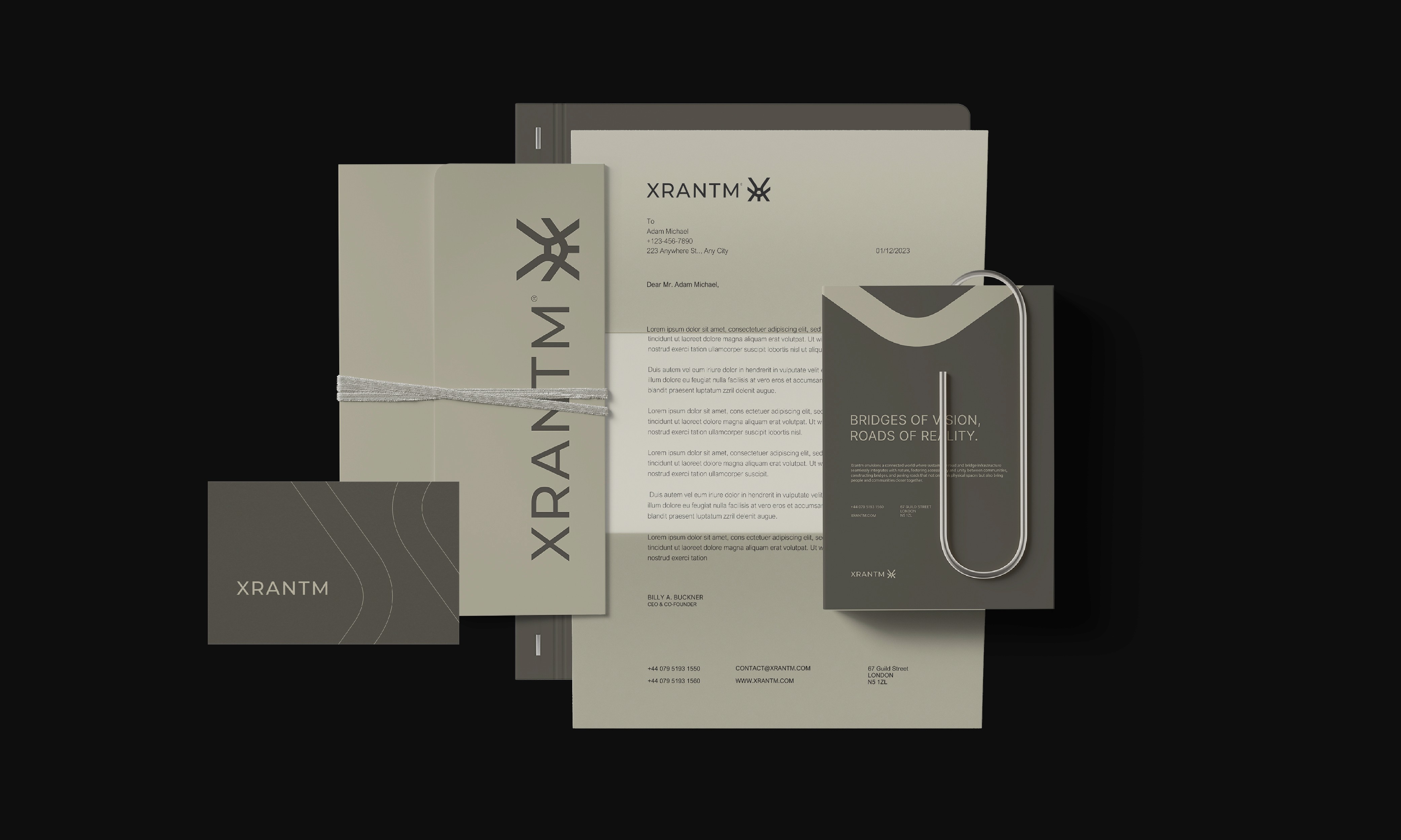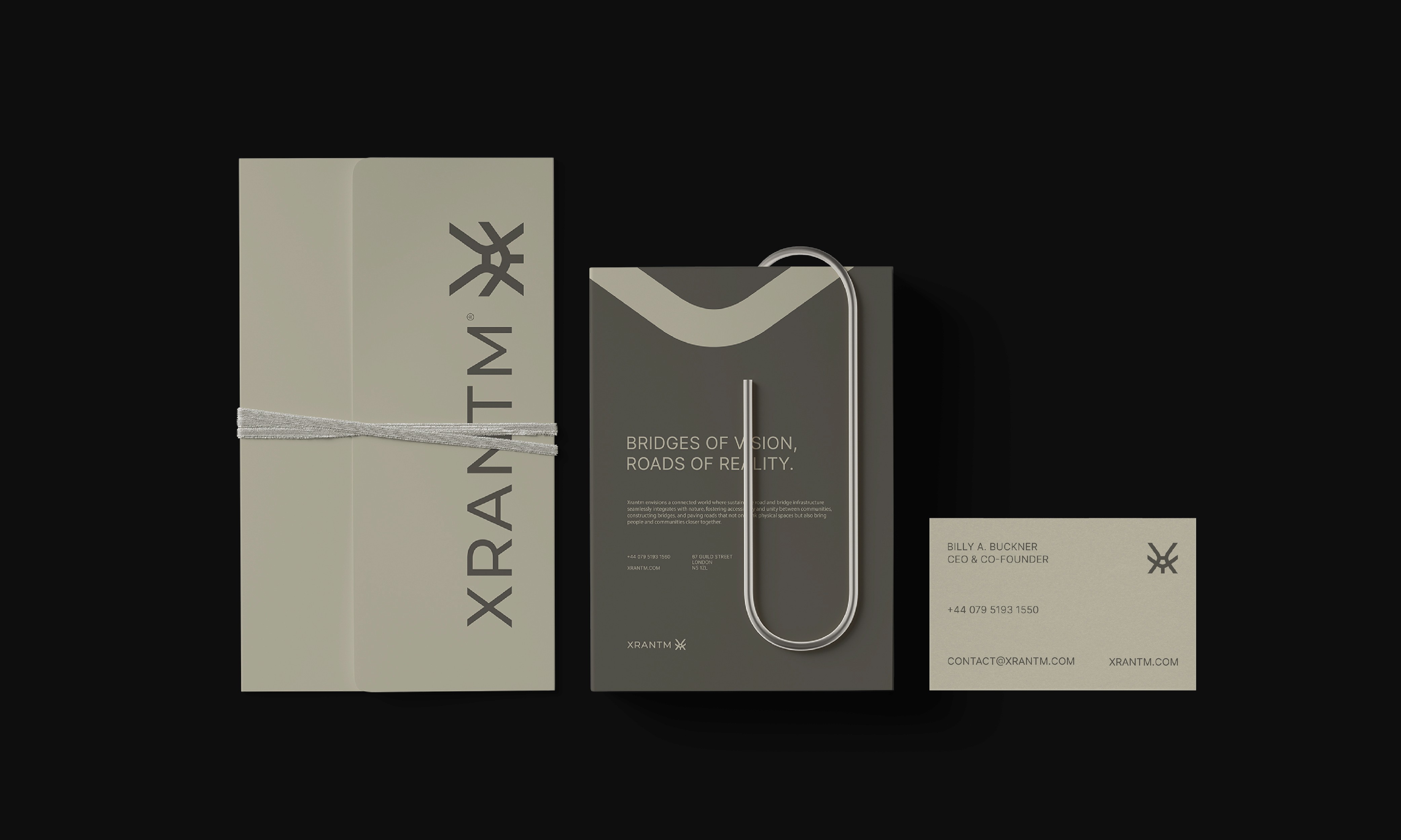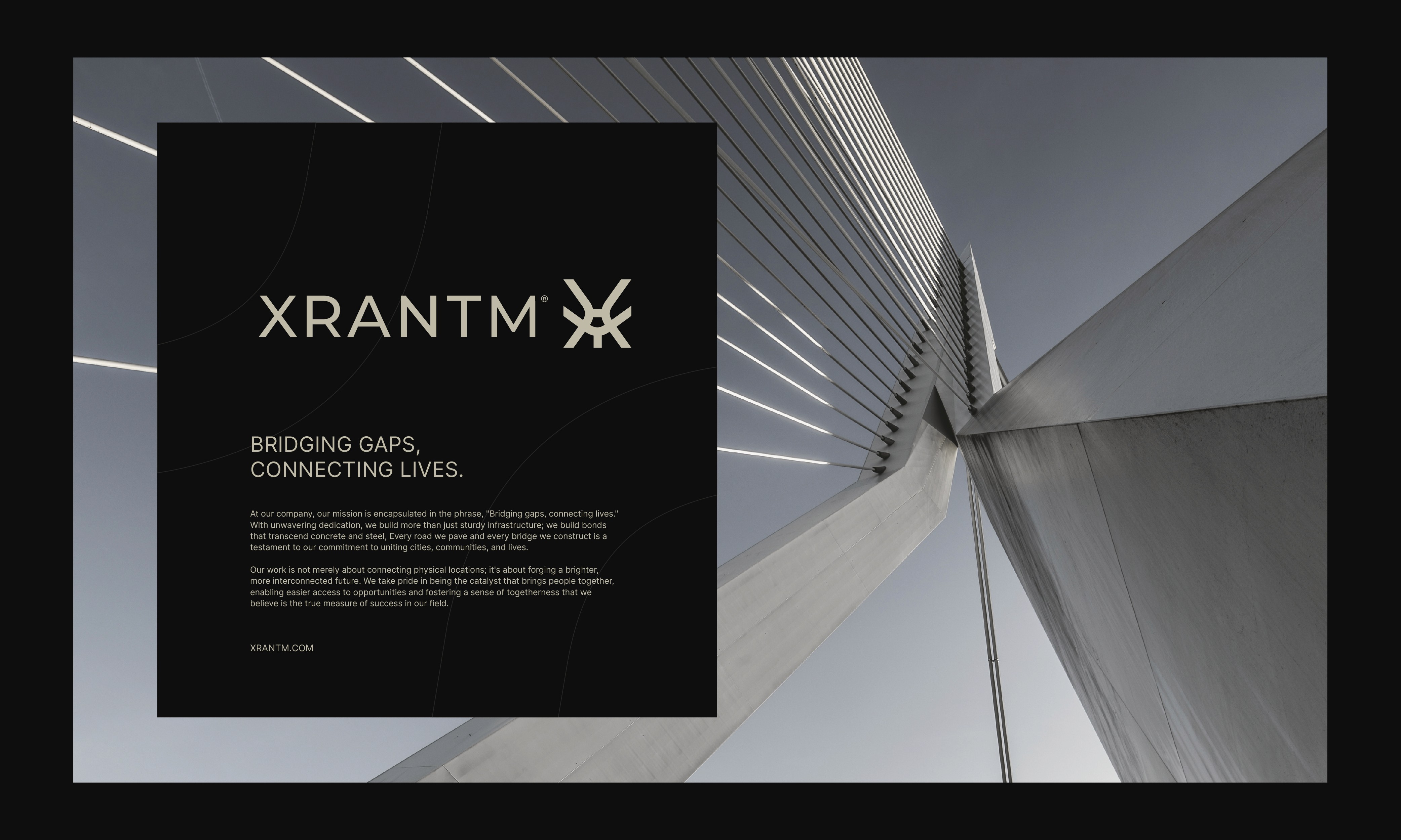 The brand identity was designed to reflect Xrantm’s forward thinking vision and engineering excellence. The logo’s intersecting lines and dynamic geometry symbolize movement, connection, and progress, capturing the essence of bridges and roads as unifying elements. A refined color palette and modern typography convey strength, precision, and ambition, while maintaining an elegant and contemporary aesthetic. Every design choice reinforces Xrantm’s core values of Innovation, Unity, Integrity, and Excellence, resulting in a sophisticated identity that positions the company as a pioneer in the future of sustainable infrastructure.