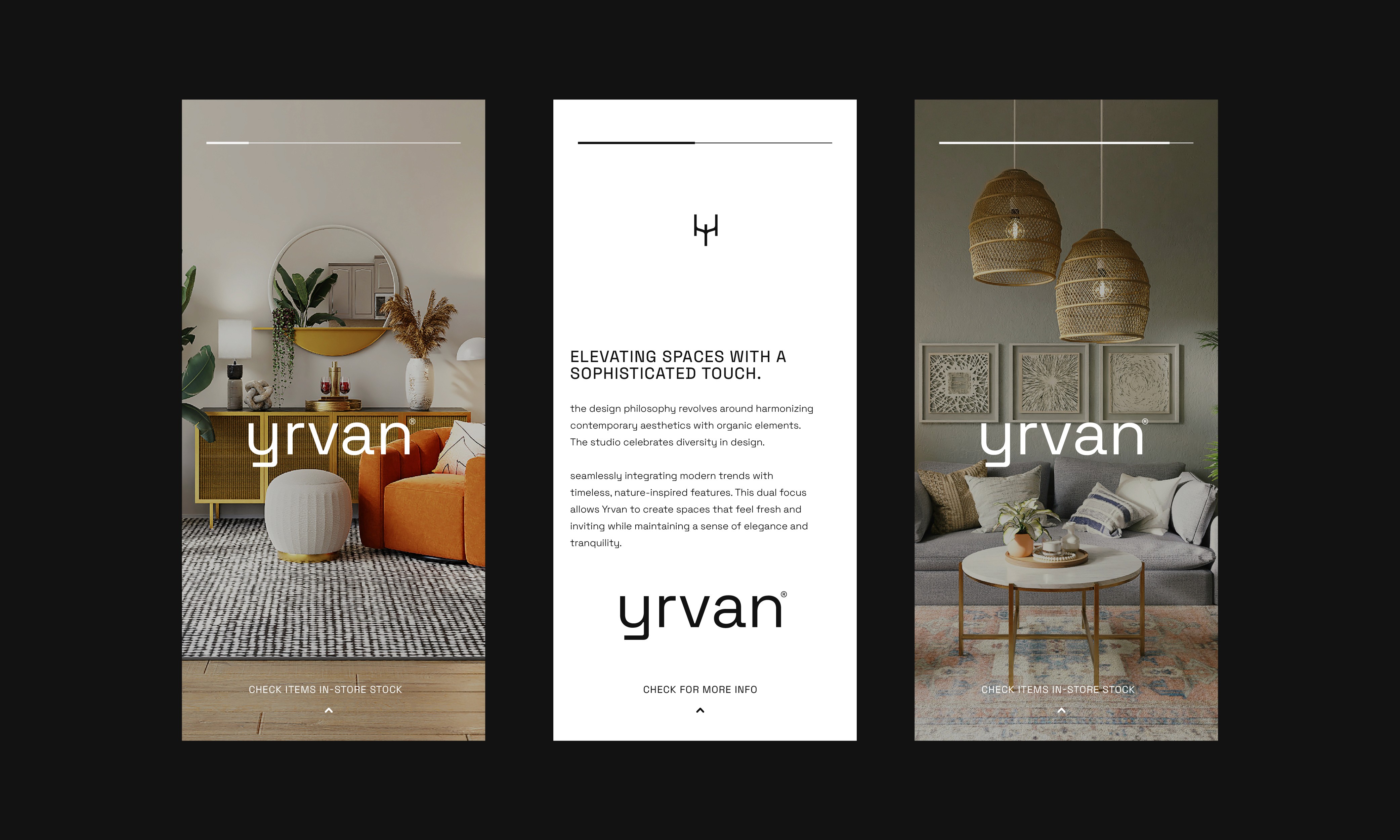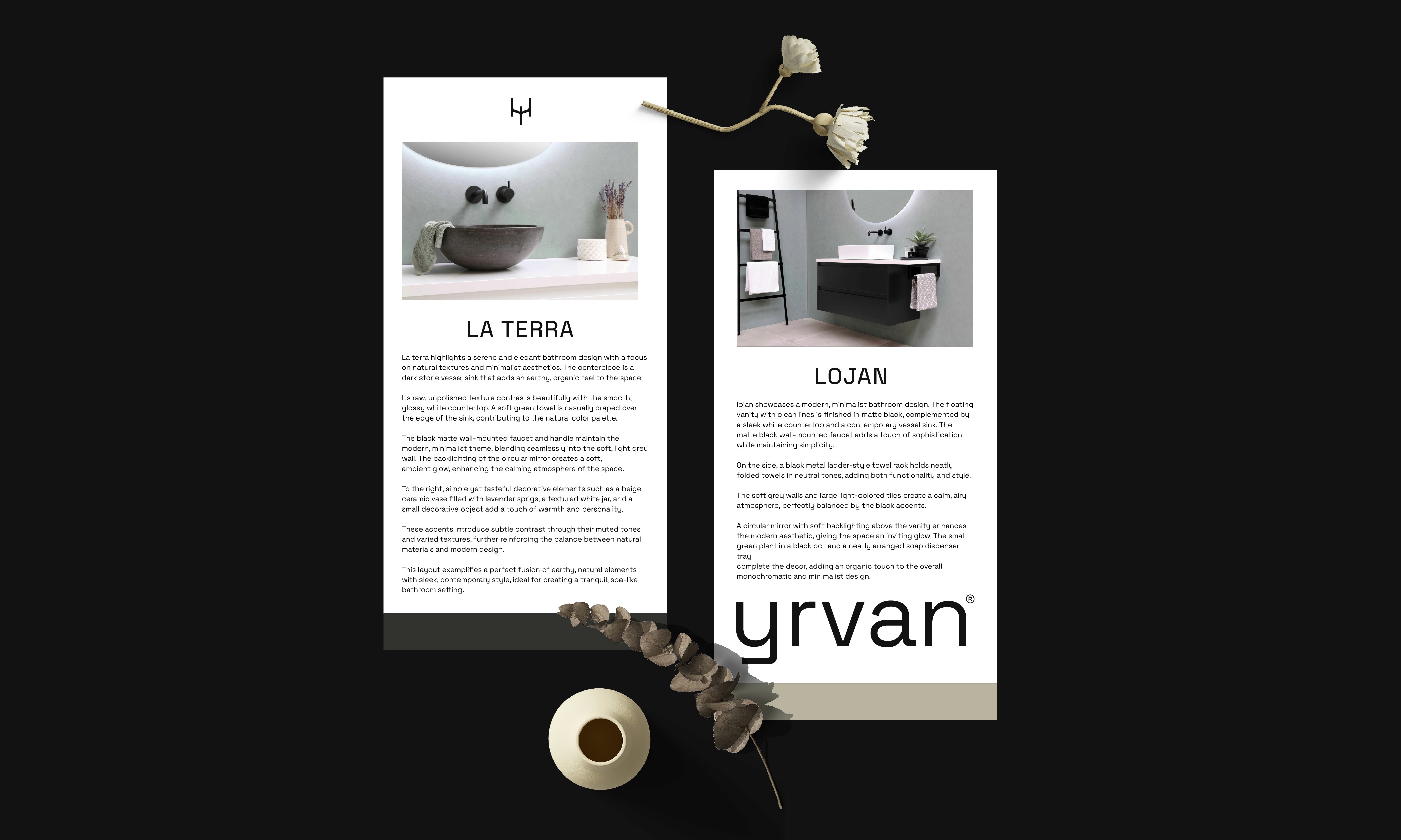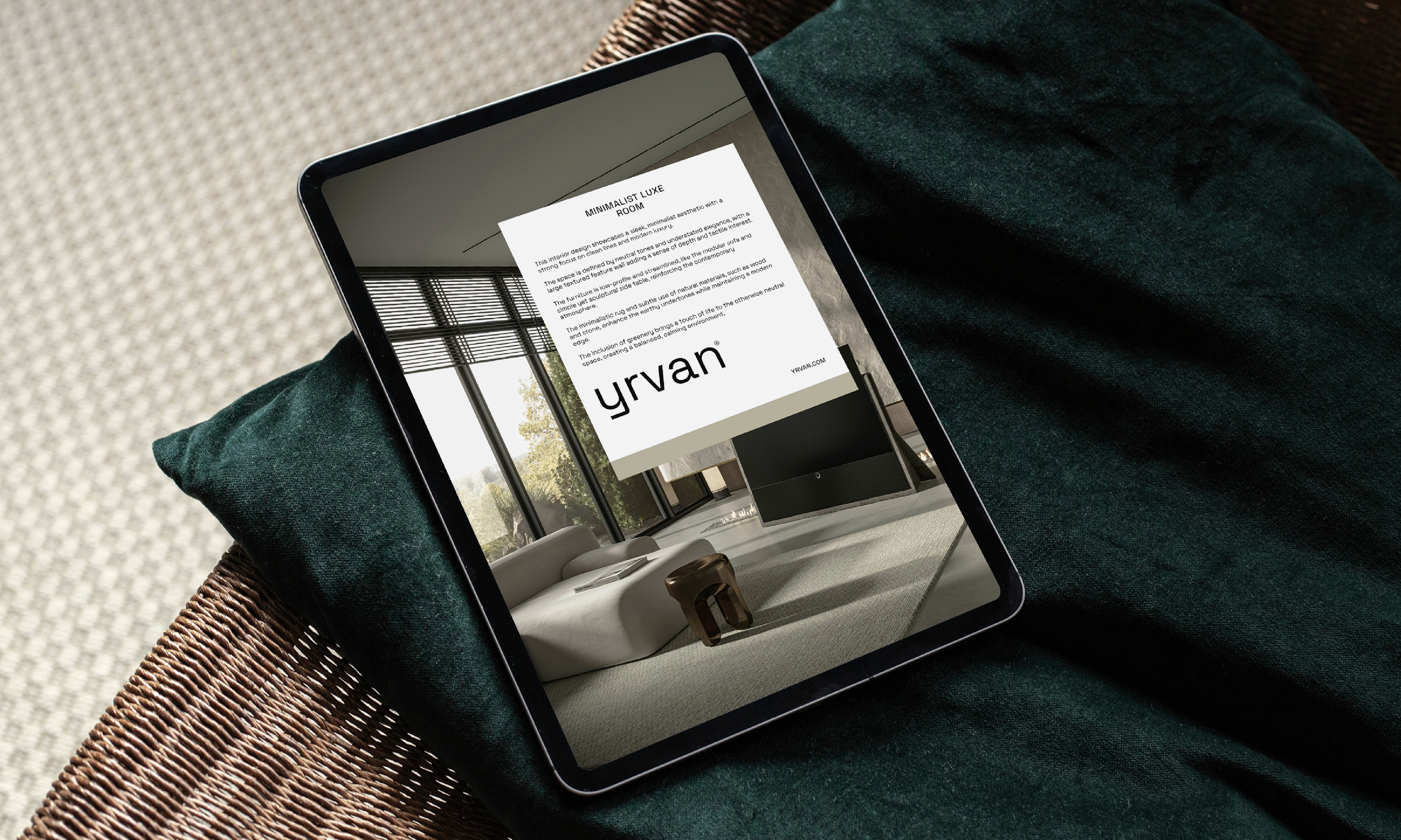 The new brand identity was developed to embody Yrvan’s balanced essence, refined, calm, and deeply connected to nature. The custom wordmark reflects this duality with its clean, modern lines and subtle organic curvature, symbolizing harmony between structure and softness. The minimalist black and white palette reinforces clarity and sophistication, while the overall visual system was designed to evoke a sense of tranquility and confidence. Every element from typography to spatial composition was crafted to communicate Yrvan’s design ethos: the art of creating spaces where modern living and natural beauty coexist seamlessly.